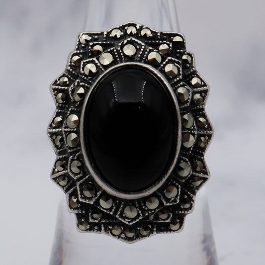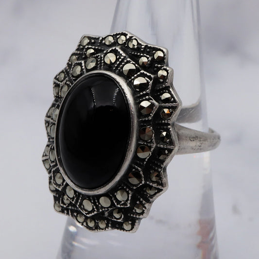 Antique Art Deco Uncas sterling, black glass stone & marcasite ring, sz 5.5