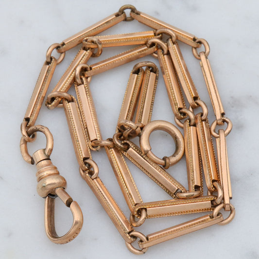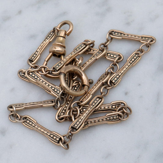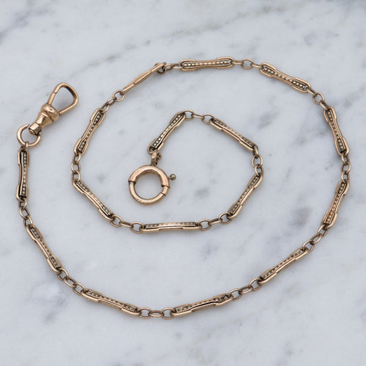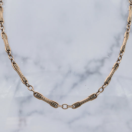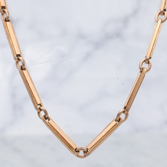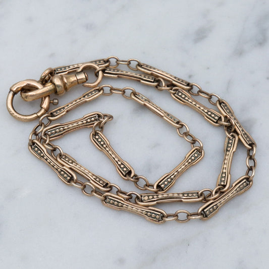 Antique Victorian gold filled fancy bar link watch chain necklace with dog clip clasp, 14.5”