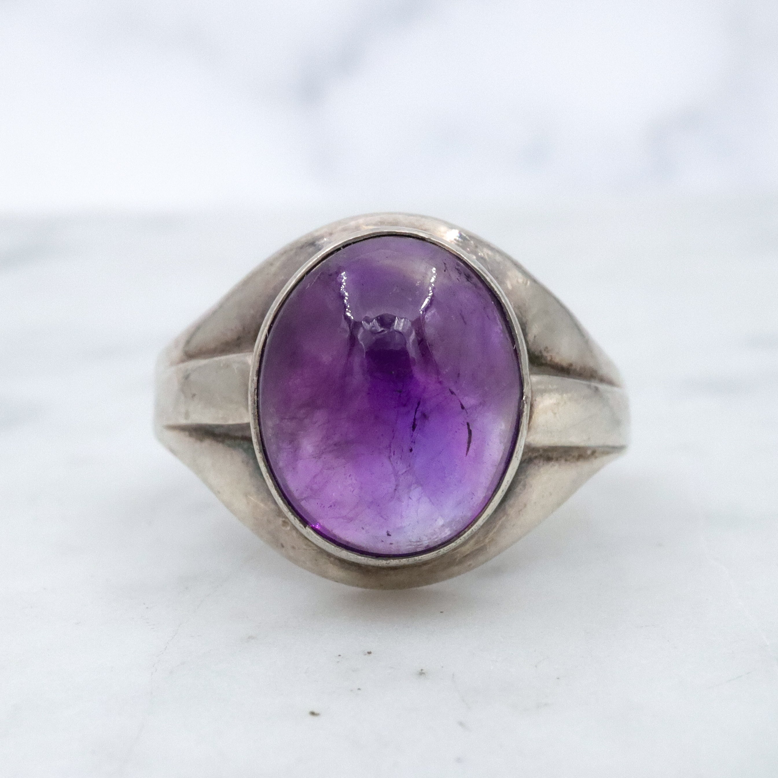 This vintage handmade sterling silver ring features an oval cabochon of genuine amethyst with beautiful inclusions and hue variations, with wide geometric style shoulders.