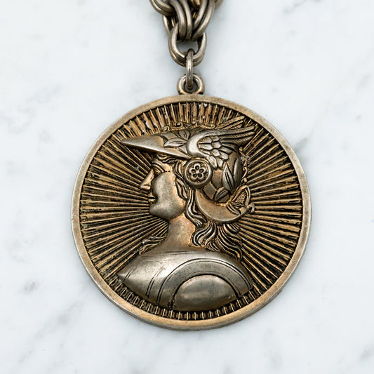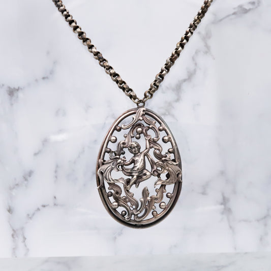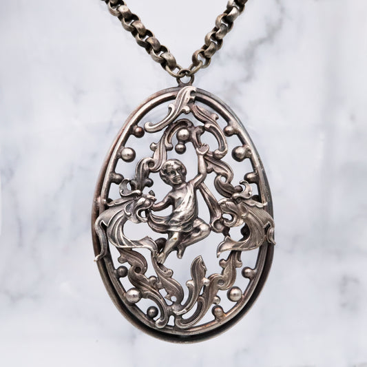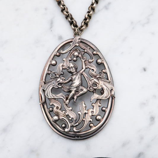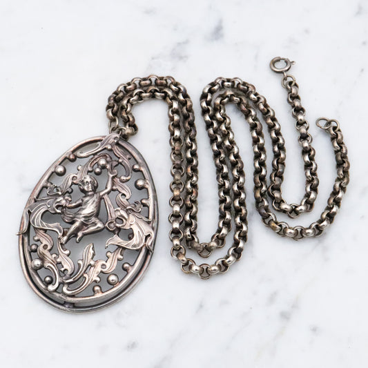 Antique Renaissance Revival silver plated putti & dragon cutout pendant necklace