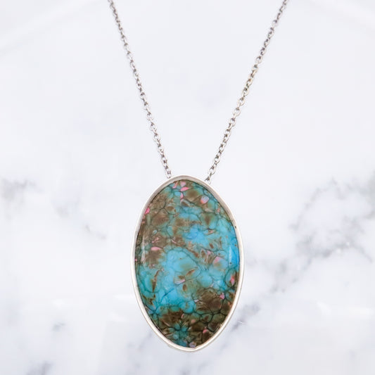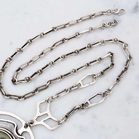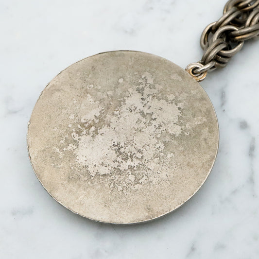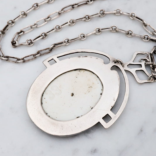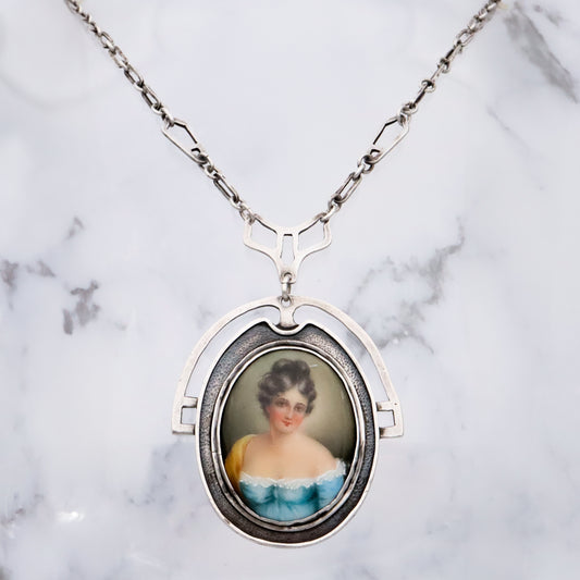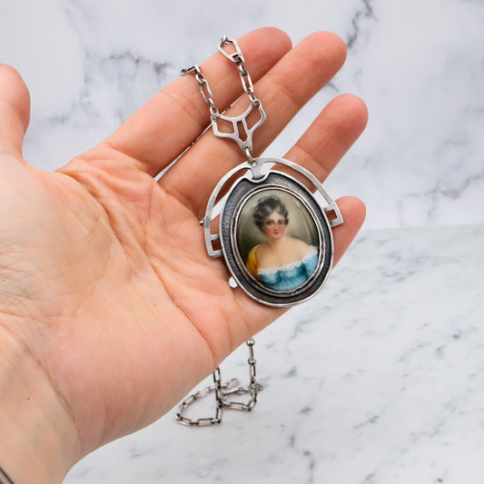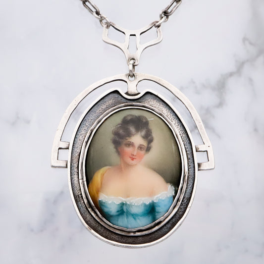 Antique Arts & Crafts hand painted portrait pendant sterling necklace