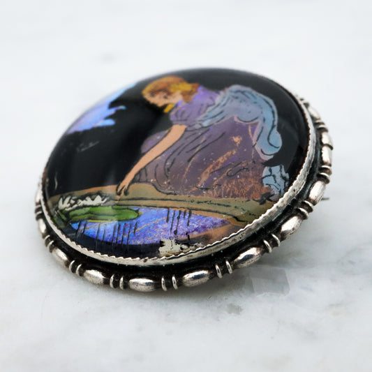 Antique Victorian 1924 England sterling morpho butterfly reverse painted brooch