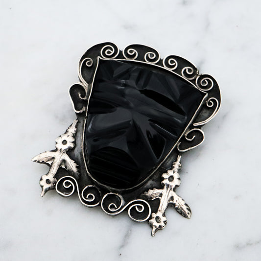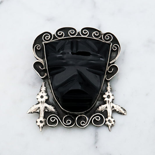 Antique 1920s Mexican sterling onyx carved Mayan mask brooch