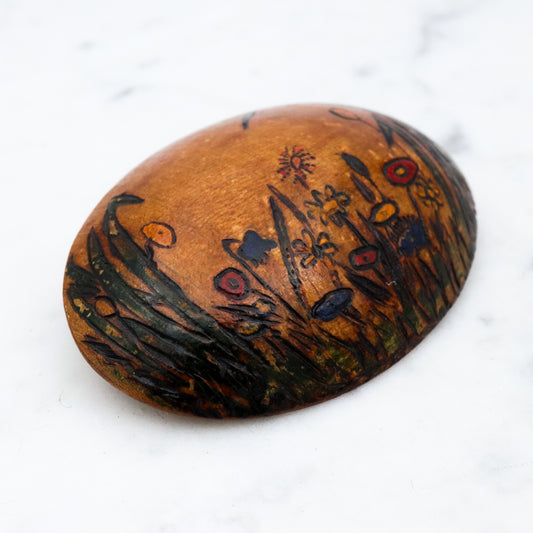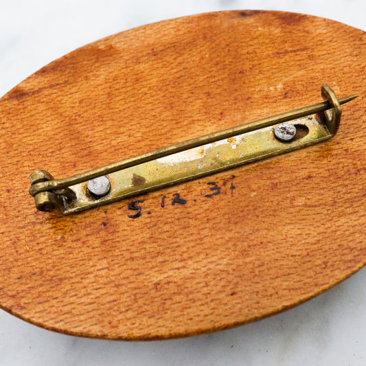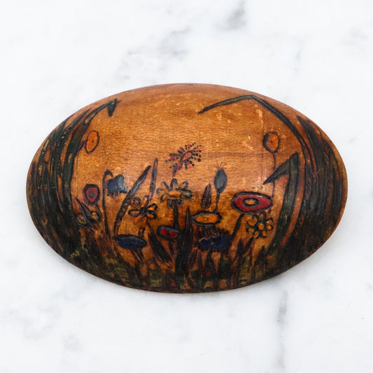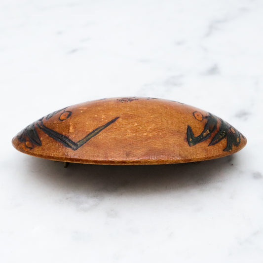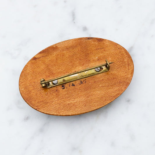 Antique 1937 handmade domed wooden brooch with painted floral scene