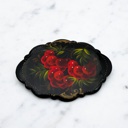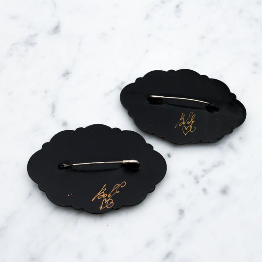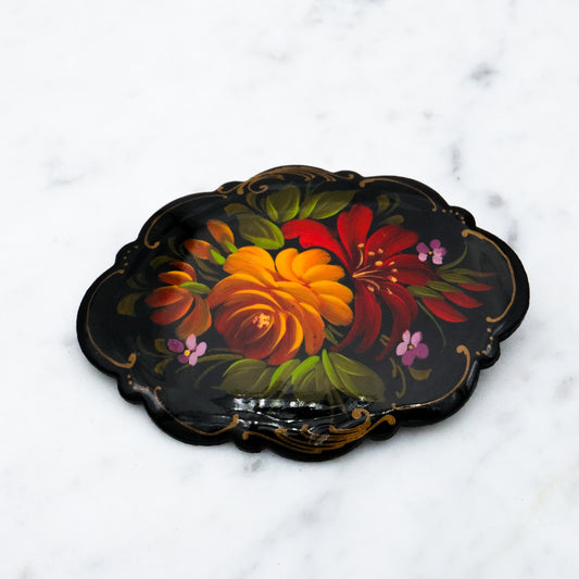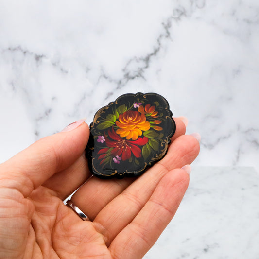 Vintage pair of hand painted floral Russian Zhostovo style brooches