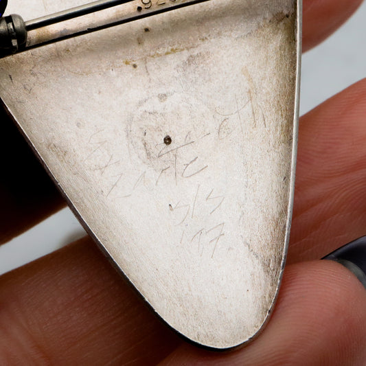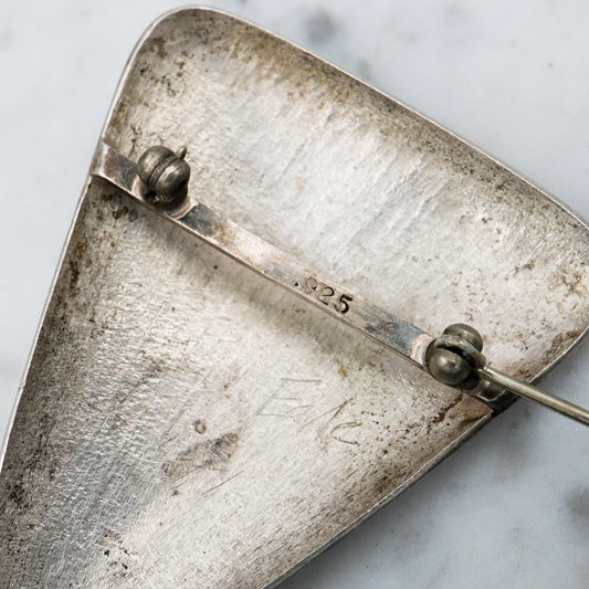 1987 pair of brushed sterling mask brooches by Modernist artist Elizabeth Earle