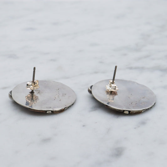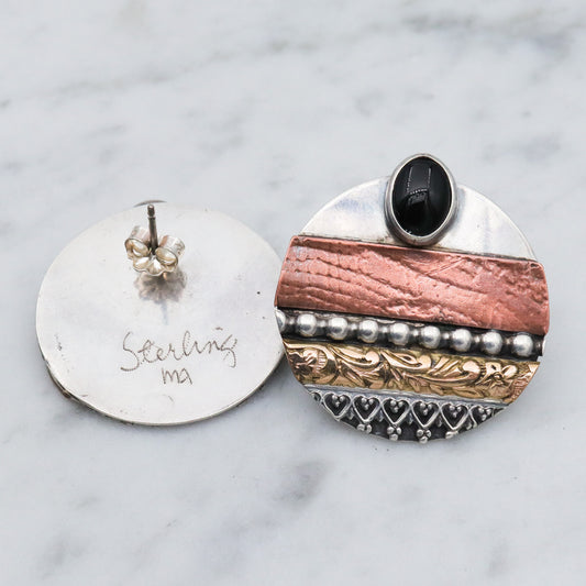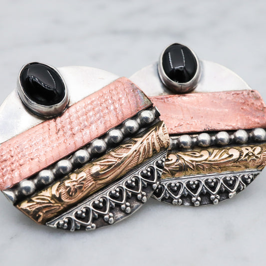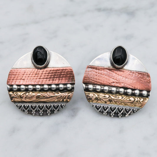 Retro sterling silver, copper & brass disc earrings with onyx, artist signed