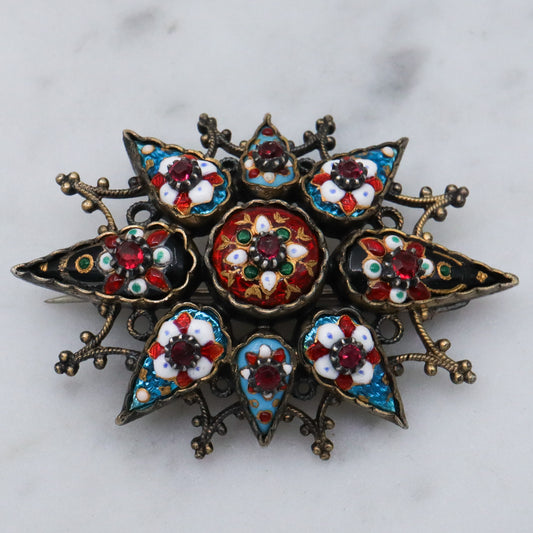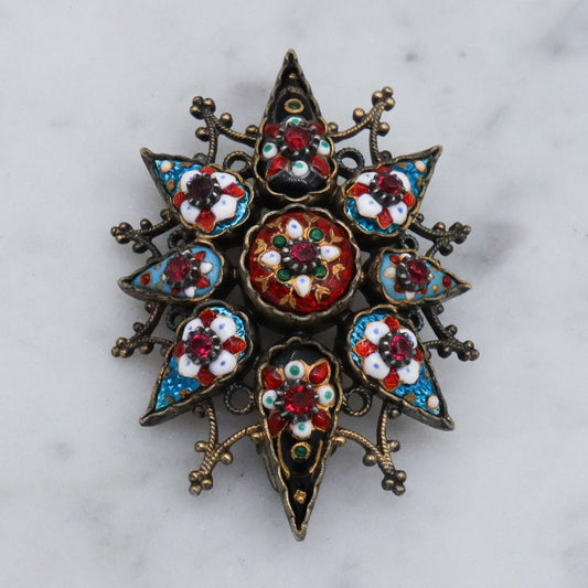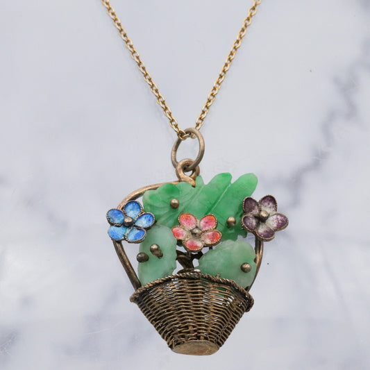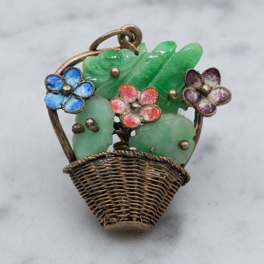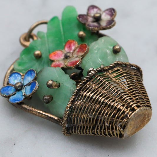 Antique Chinese gilt silver jade & enamel flower basket pendant