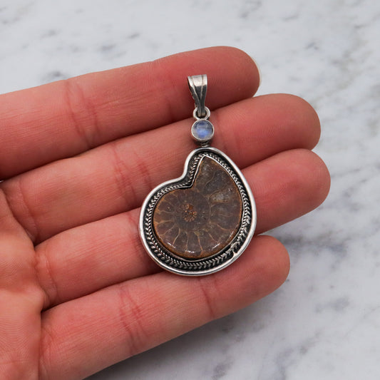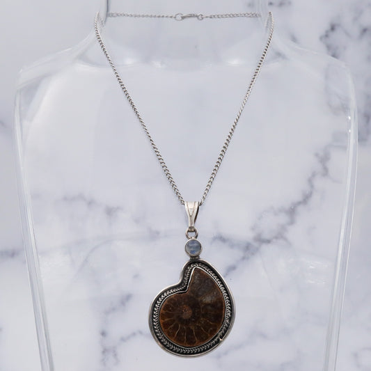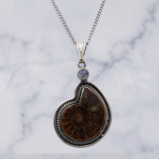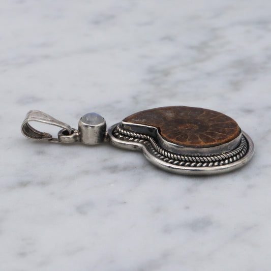 Vintage sterling silver, ammonite & rainbow moonstone pendant