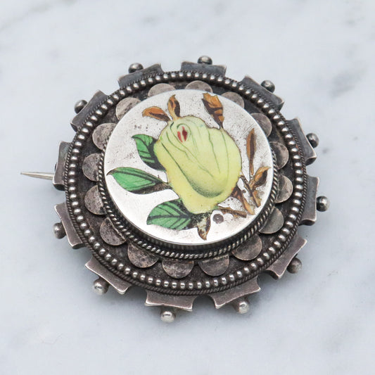 Antique Aesthetic sterling silver & enamel brooch with locket back
