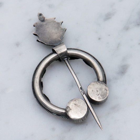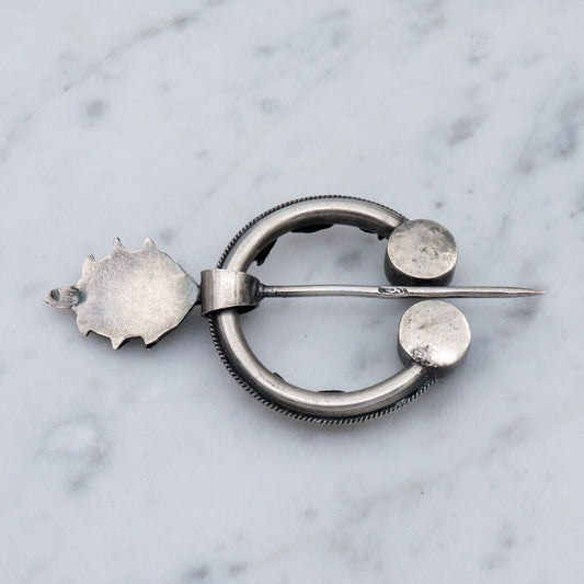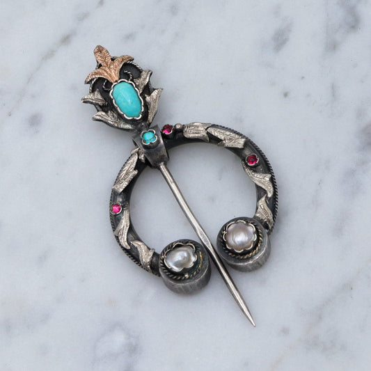 Antique Middle Eastern silver fibula pin w/turquoise, pearl & faux ruby