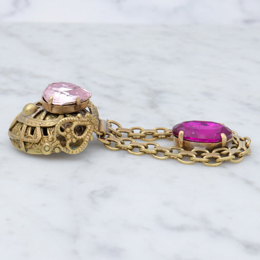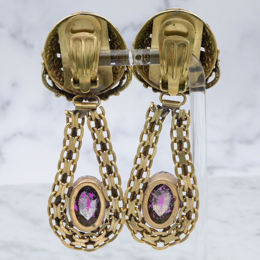 Massive Renaissance Revival brass & purple rhinestones drop clip on earrings
