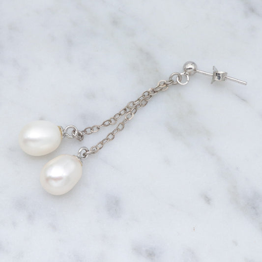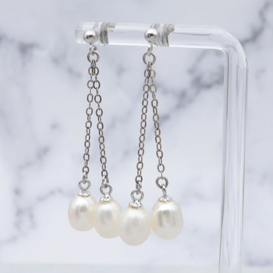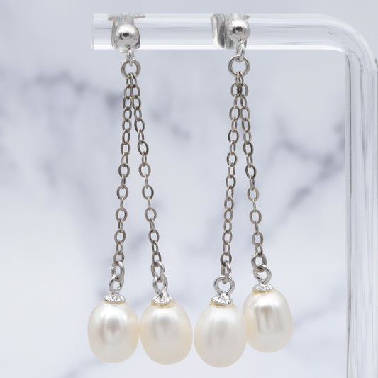 Vintage sterling double chain dangle earrings w/ white oval cultured pearl drops