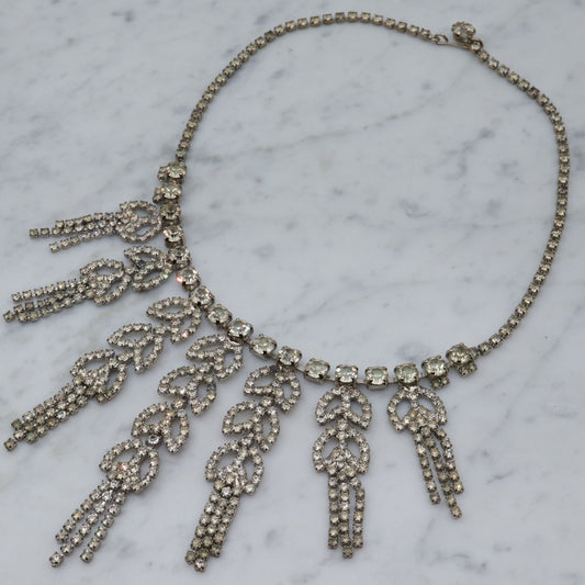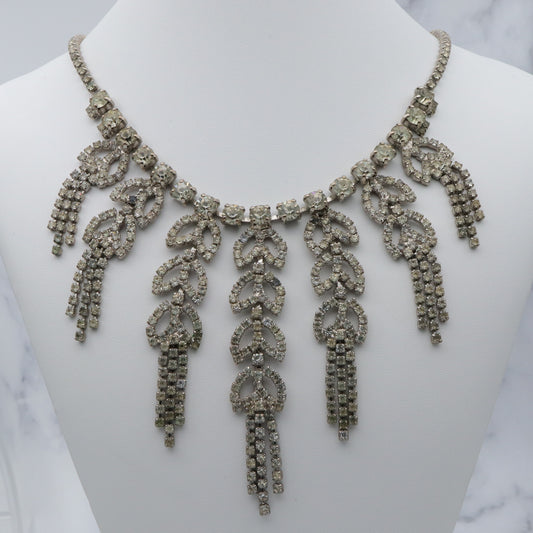 Vintage leaf drop fringe rhinestone silver tone necklace