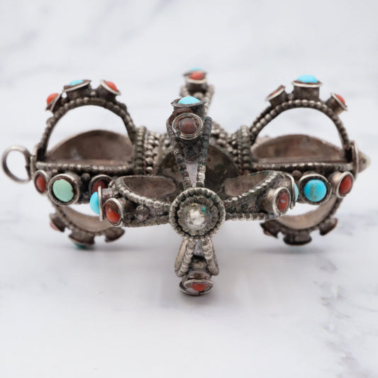 Antique tribal silver turquoise and coral extra large crown shaped pendant