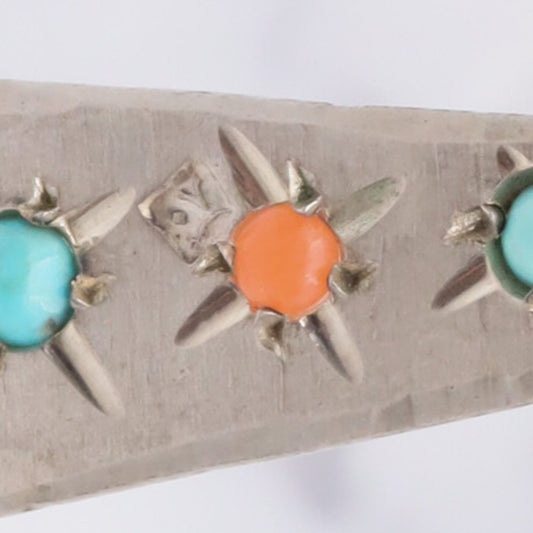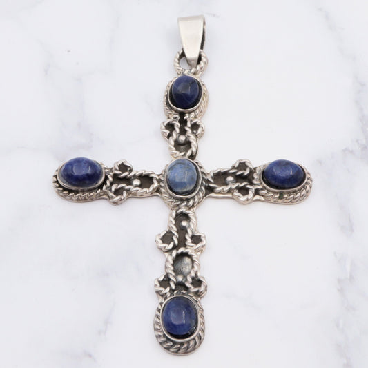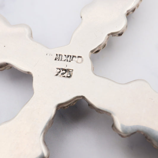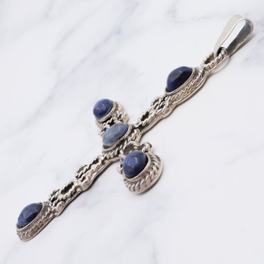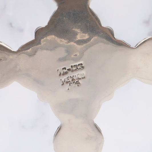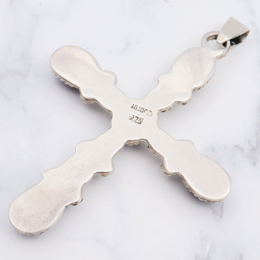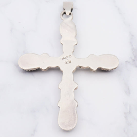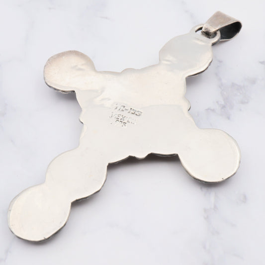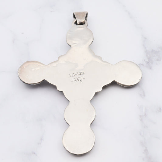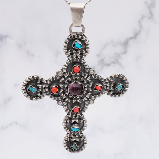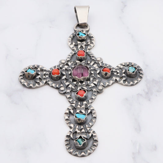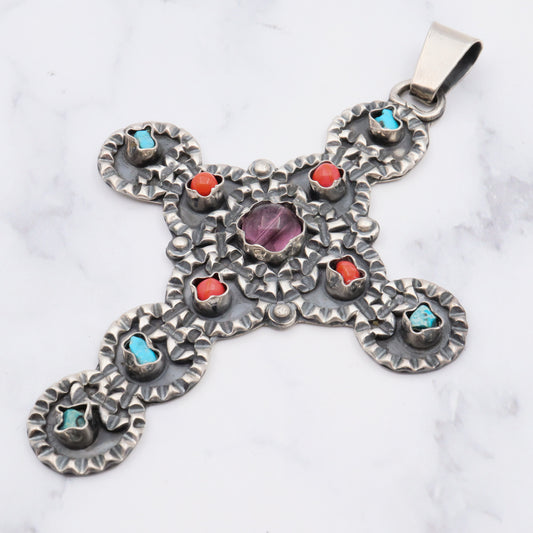 Vintage Mexican sterling silver, turquoise, coral & amethyst large cross pendant