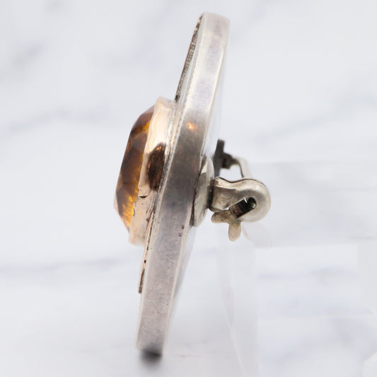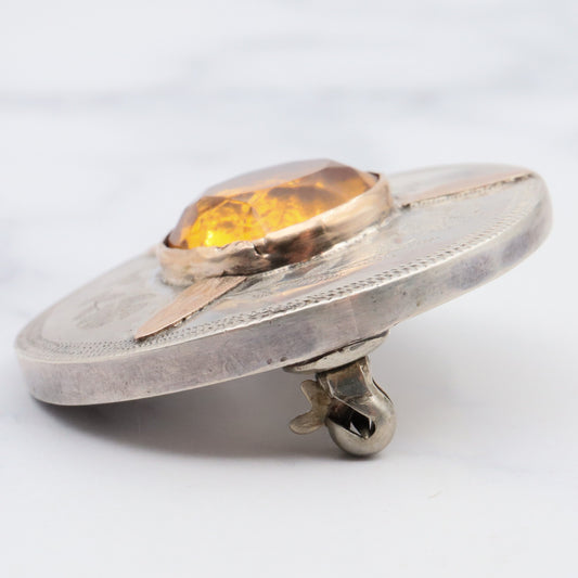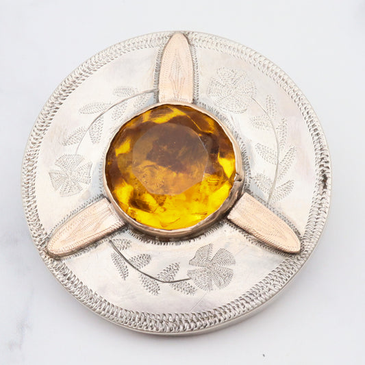 Antique victorian hand engraved sterling silver brooch with gold accents and citrine glass