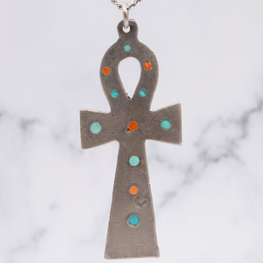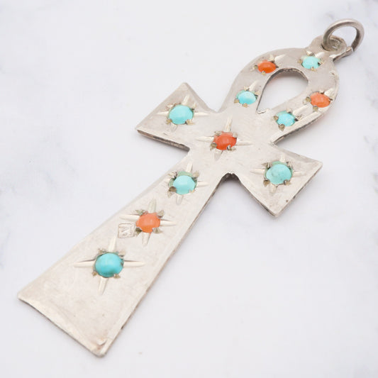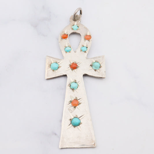 Antique sterling silver turquoise and coral Egyptian Ankh pendant