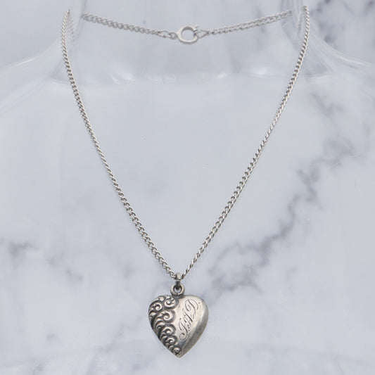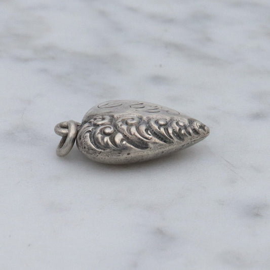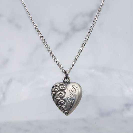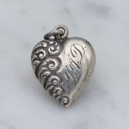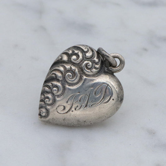 Antique Victorian repousse puffy heart charm pendant with monogram “J.A.D”