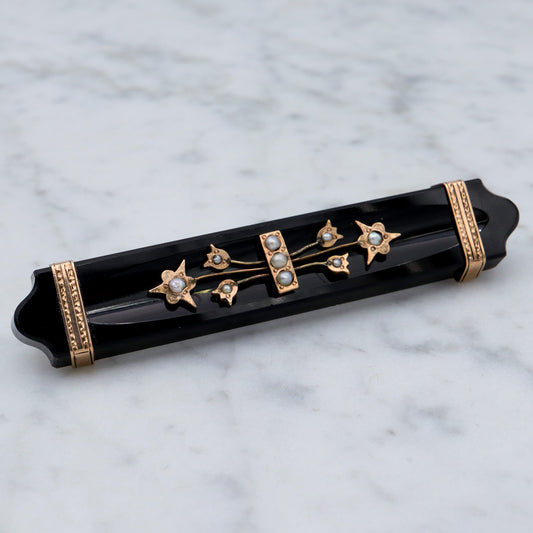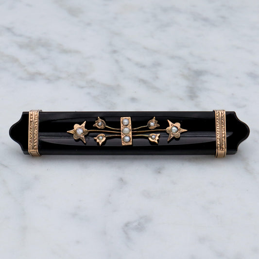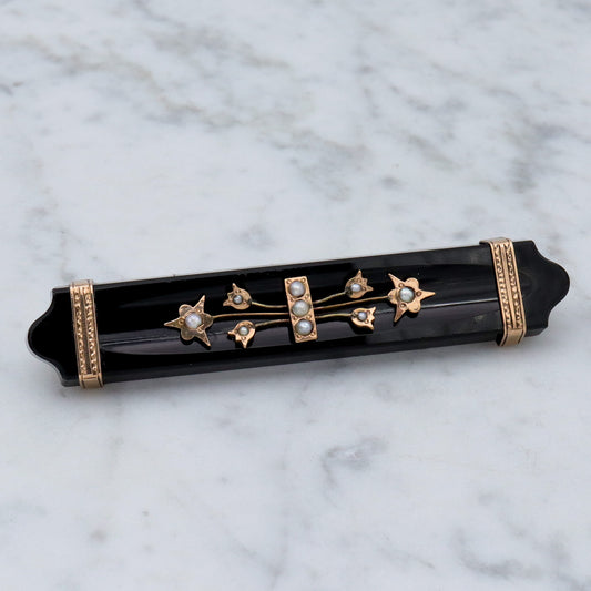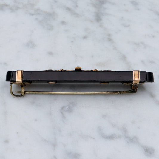 Antique Victorian carved jet & pearl 10k gold mourning bar brooch