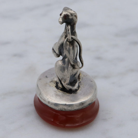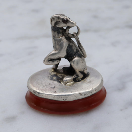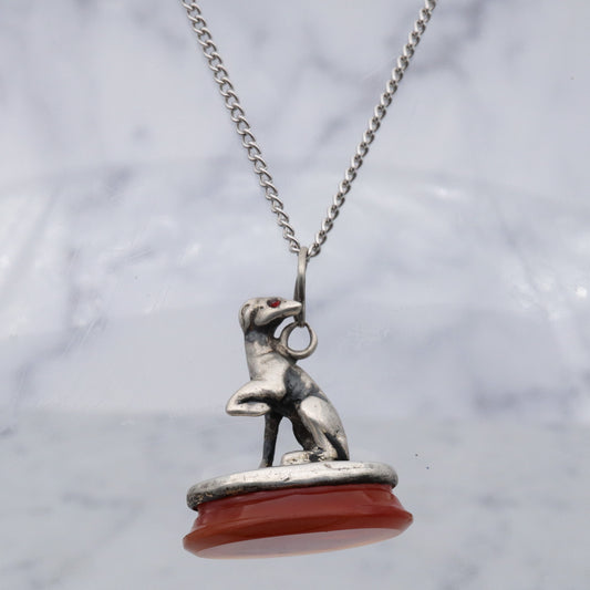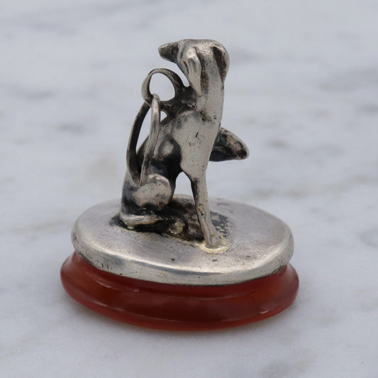 Early Victorian sterling silver greyhound dog on carnelian fob pendant