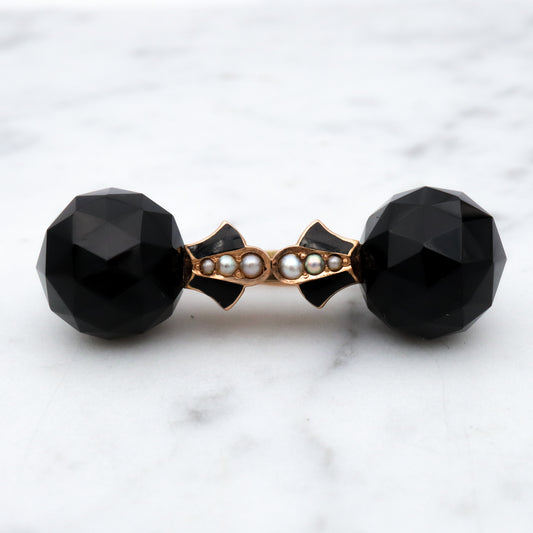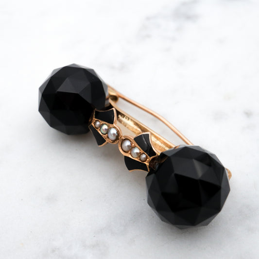 Antique Victorian 10k gold faceted jet glass, pearl, & enamel mourning brooch