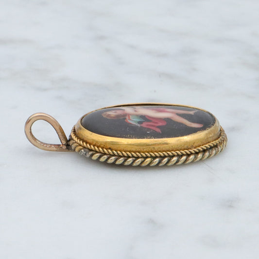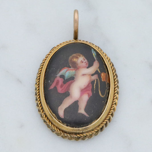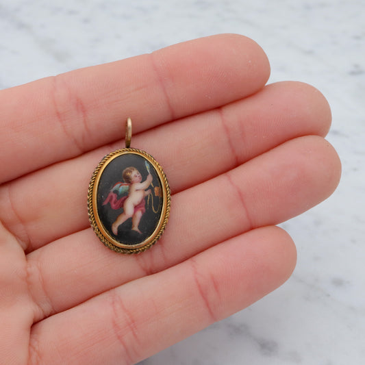 Antique Victorian hand painted winged cherub gilt metal pendant