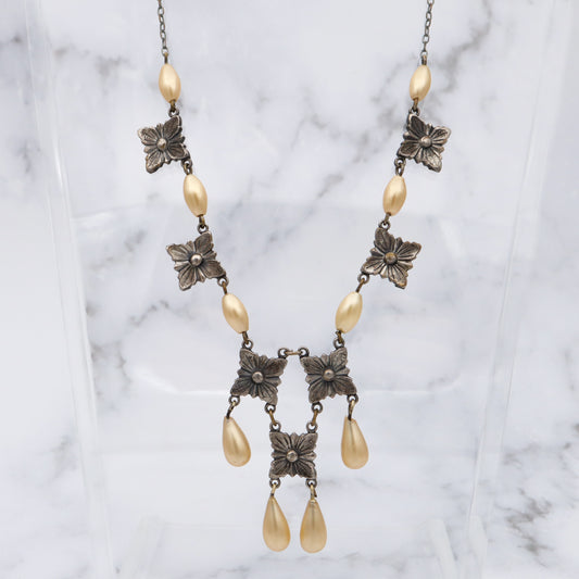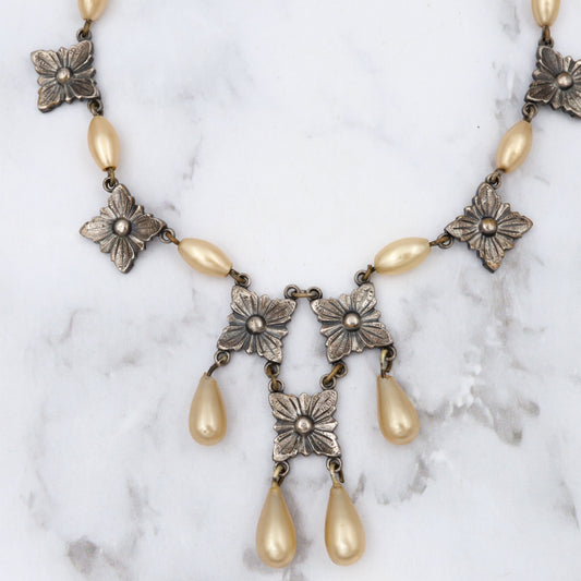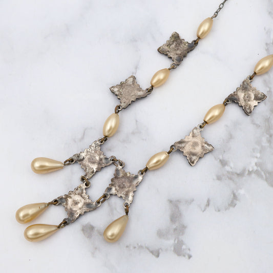 Antique Victorian silver plated brass geometric flower link & faux pearl drop necklace, 15"