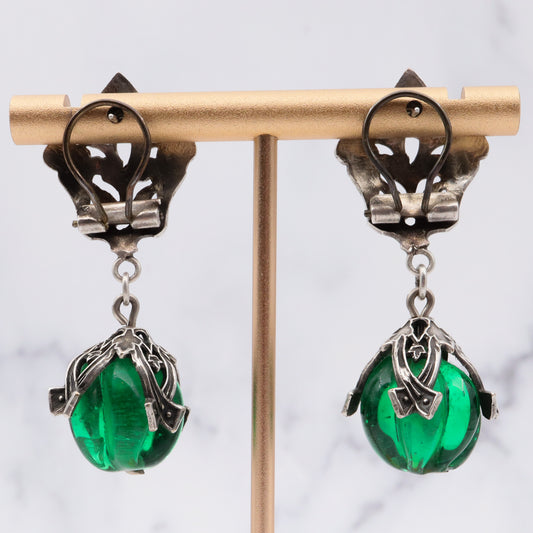 Antique Victorian Renaissance Revival silver plated carved green glass drop bead earrings