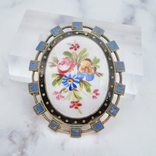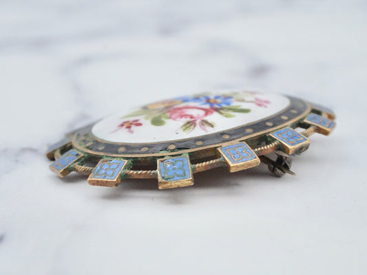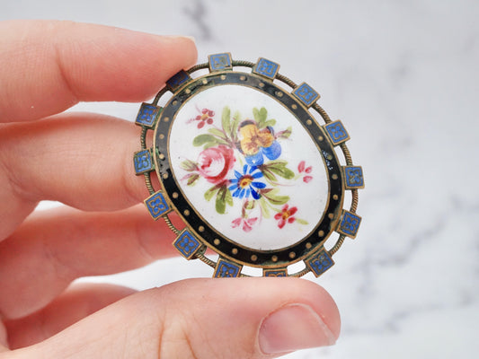 Antique Victorian hand-painted enamel and gilt metal brooch