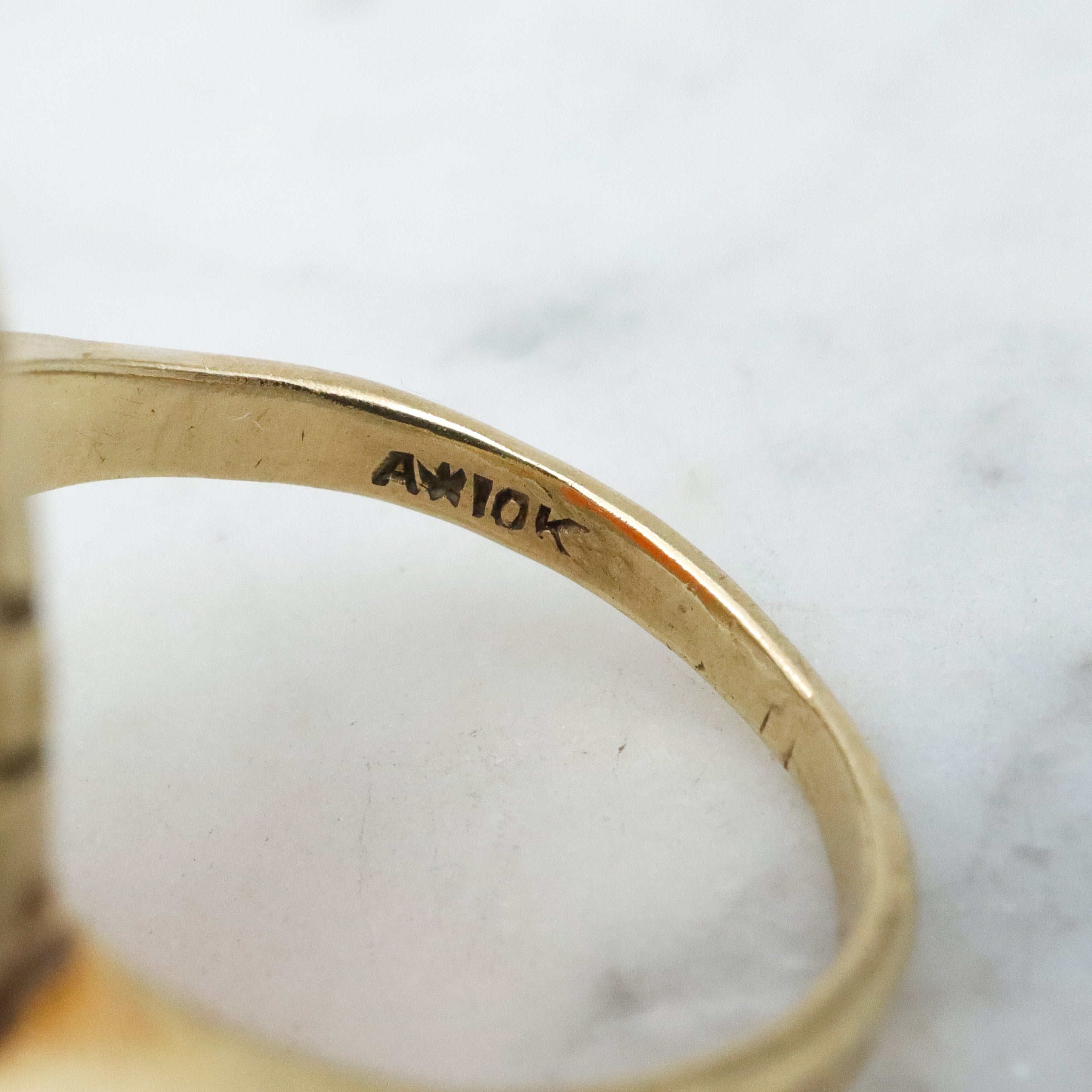 This stunning and unique Art Deco era ring is make of solid 10k gold and features an oval orange red carnelian gemstone cabochon with hand engraved floral designs, bezel set with a border of black enamel and lapis lazuli gemstone inlaid corners; the shoulders have a stepped geometric design and the underside has an architectural frame design.