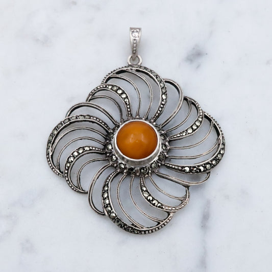 This antique Art Deco Theda sterling silver fancy cross features gorgeous marcasite embellishments throughout. This pendant weighs 3 grams and measures 38mm tall. This piece is in good antique condition with surface wear and is marked as shown.