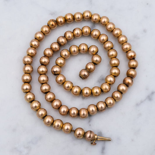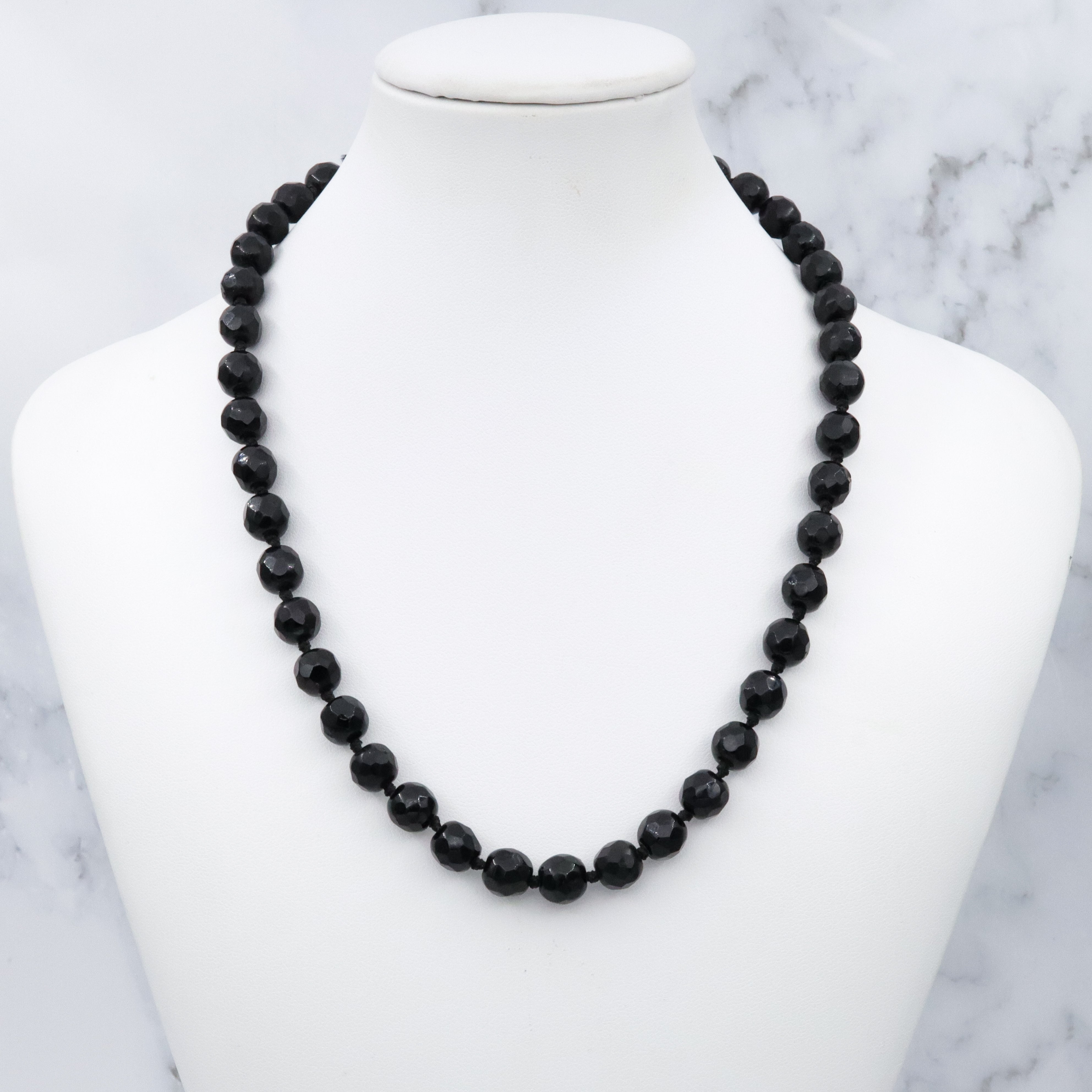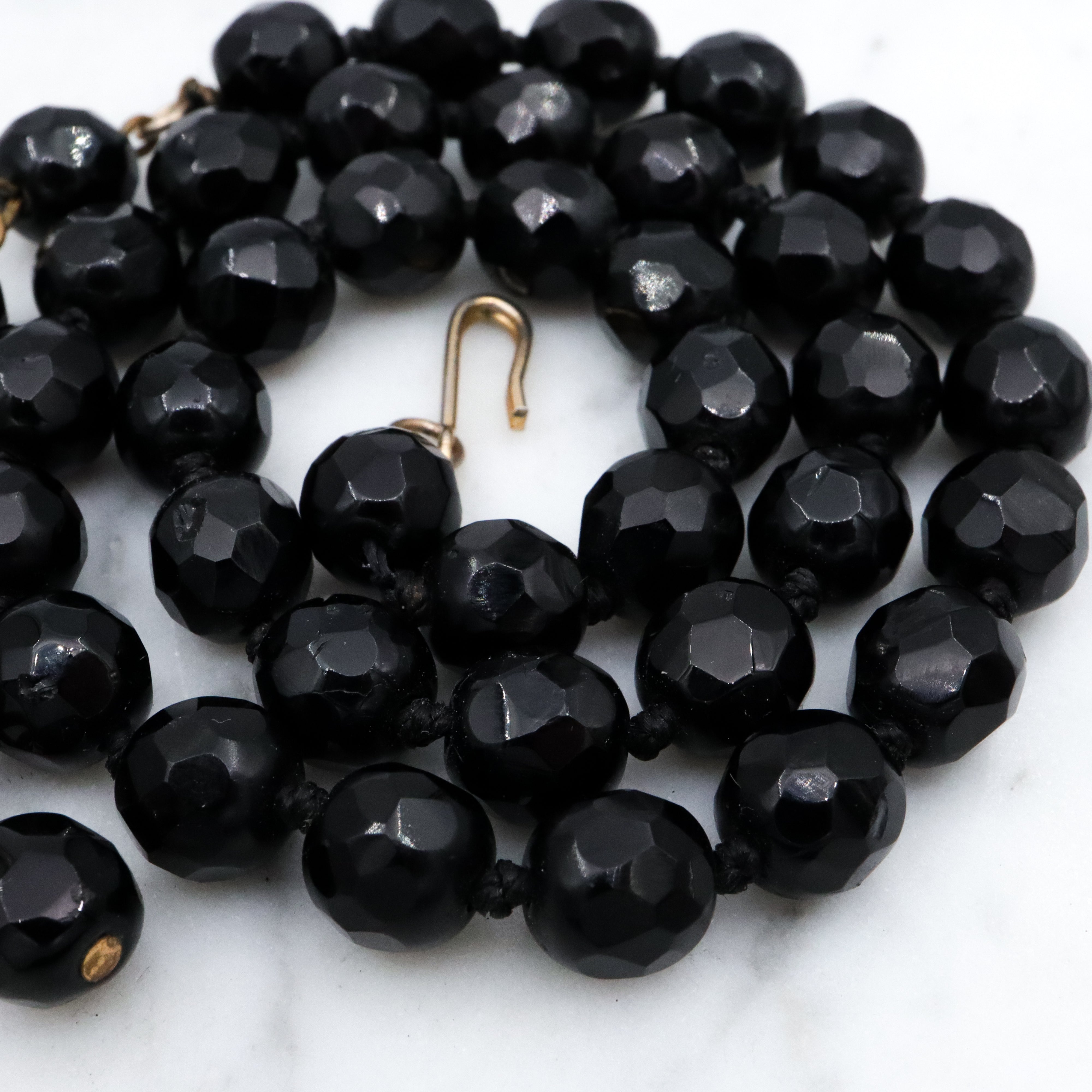 This simple, elegant, beaded antique necklace features a strand of round faceted French jet glass beads, with a hook clasp & adjustable length.