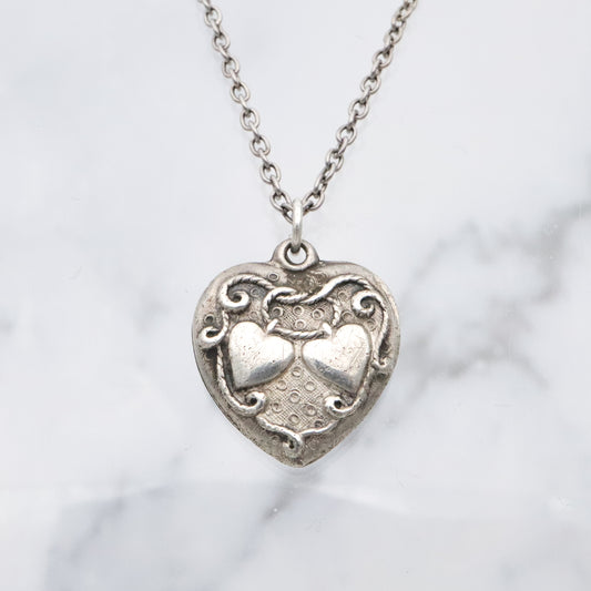 This antique sterling silver pendant features a beautiful amethyst gemstone teardrop with dark inclusions throughout. The bail is new on this piece. This pendant weighs 7.6 grams and measures 28mm in length, not including the bail. This piece is in great vintage condition with light wear and is not marked but has been tested and is guaranteed.