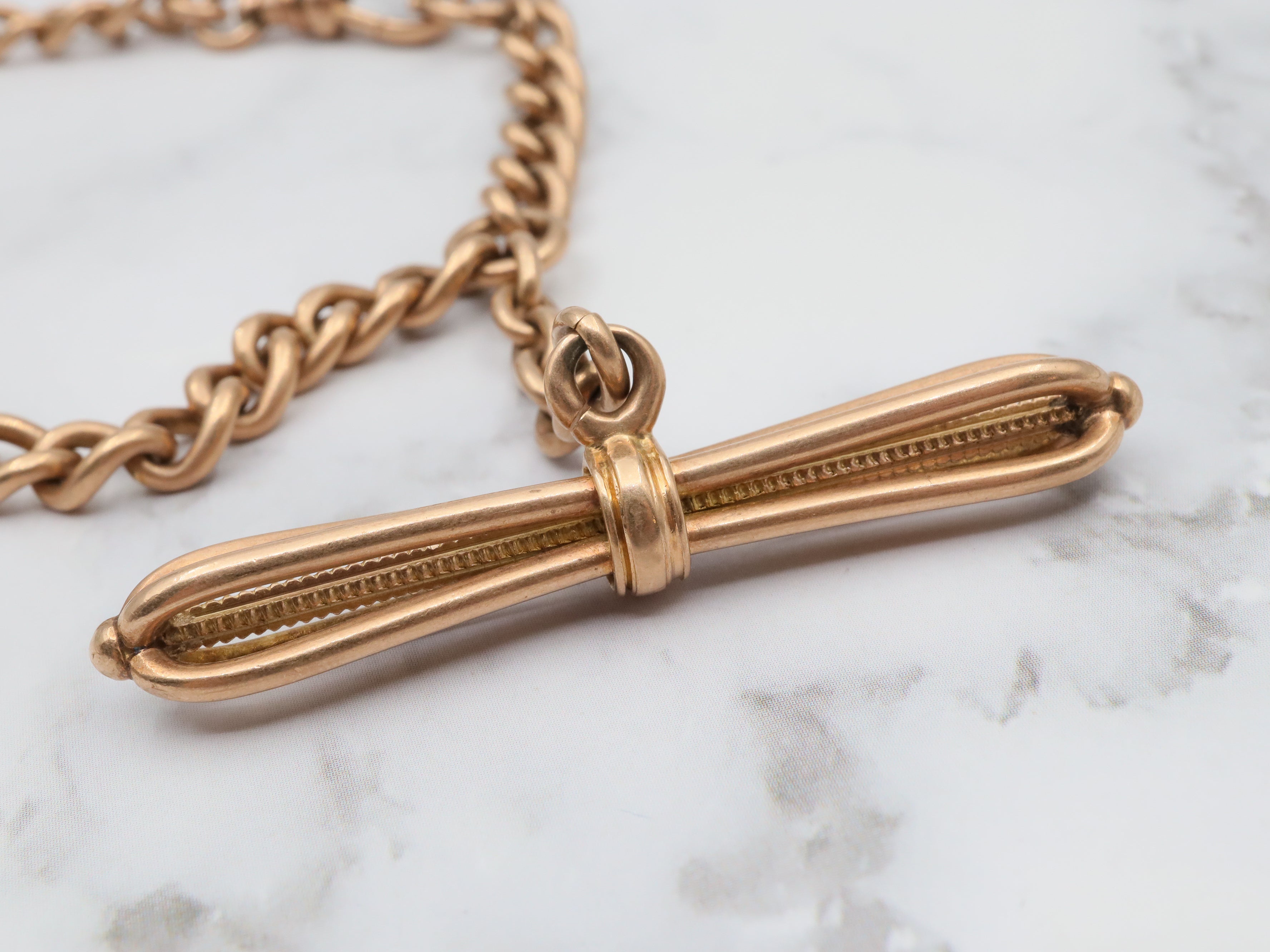 Antique Victorian 14k gold curb link Albert watch chain with fancy T-bar, 13.75"