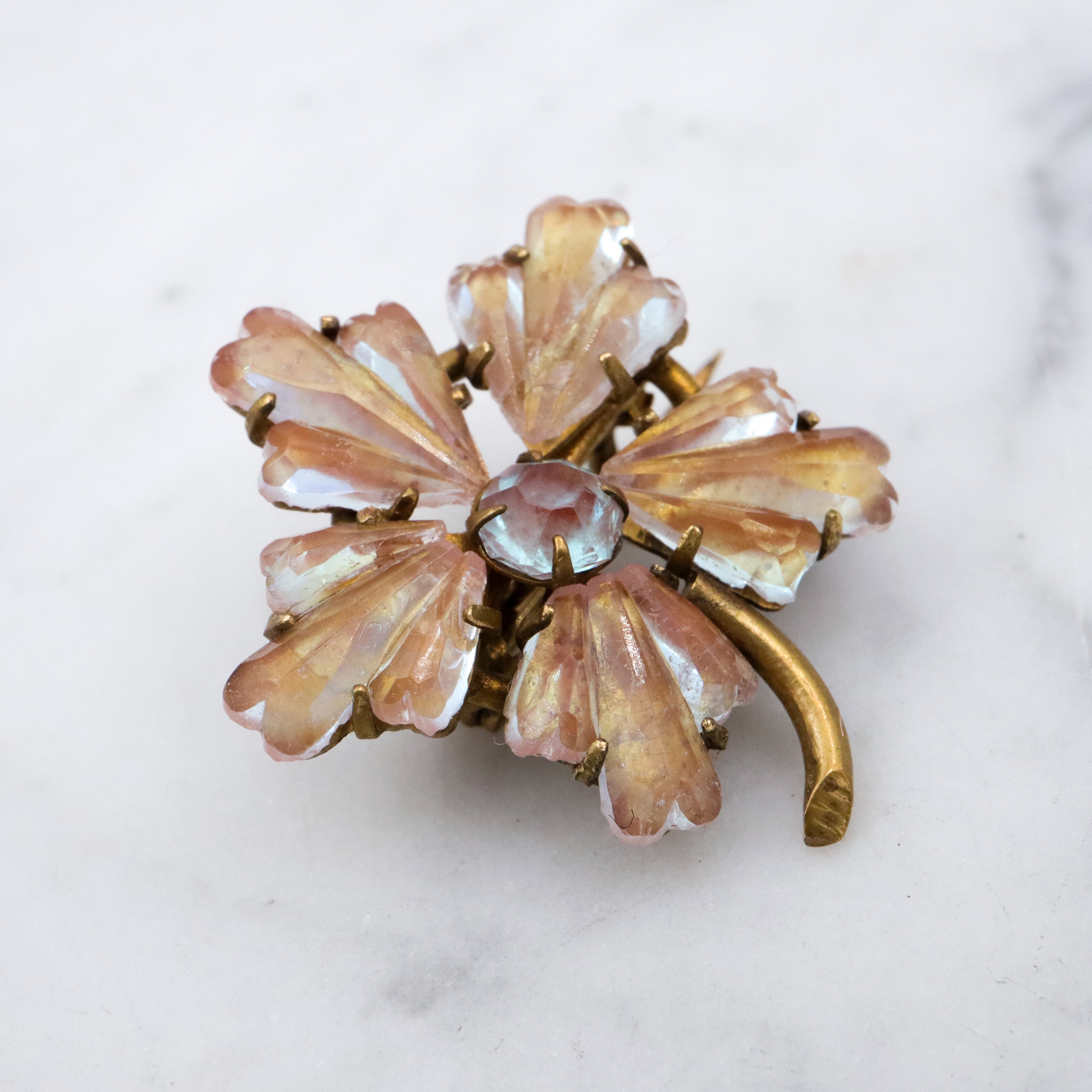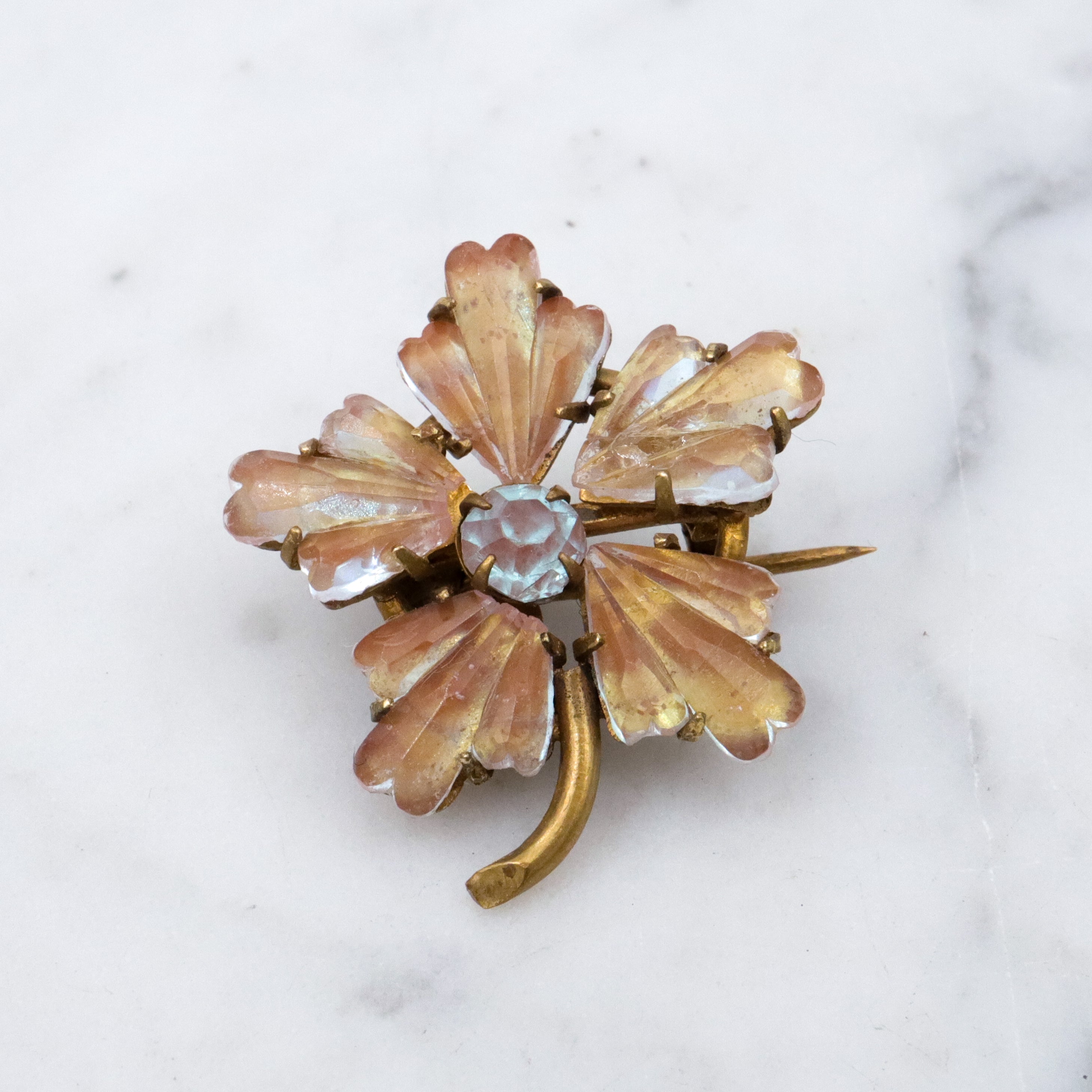 This beautiful Victorian era gilt metal pin features a five-petal flower design with tri-tipped petals made of the collectible saphiret gem, and a single faceted saphiret center that moves independently. Saphiret is a rare, highly coveted, antique art glass primarily produced in Gablonz, Czechoslovakia, during the mid-19th to early-20th century. It was created by fusing real gold with sapphire-colored glass, resulting in a distinct, color-changing material that shifts from brown, to pink, to blue. This piece is so much better in real life.