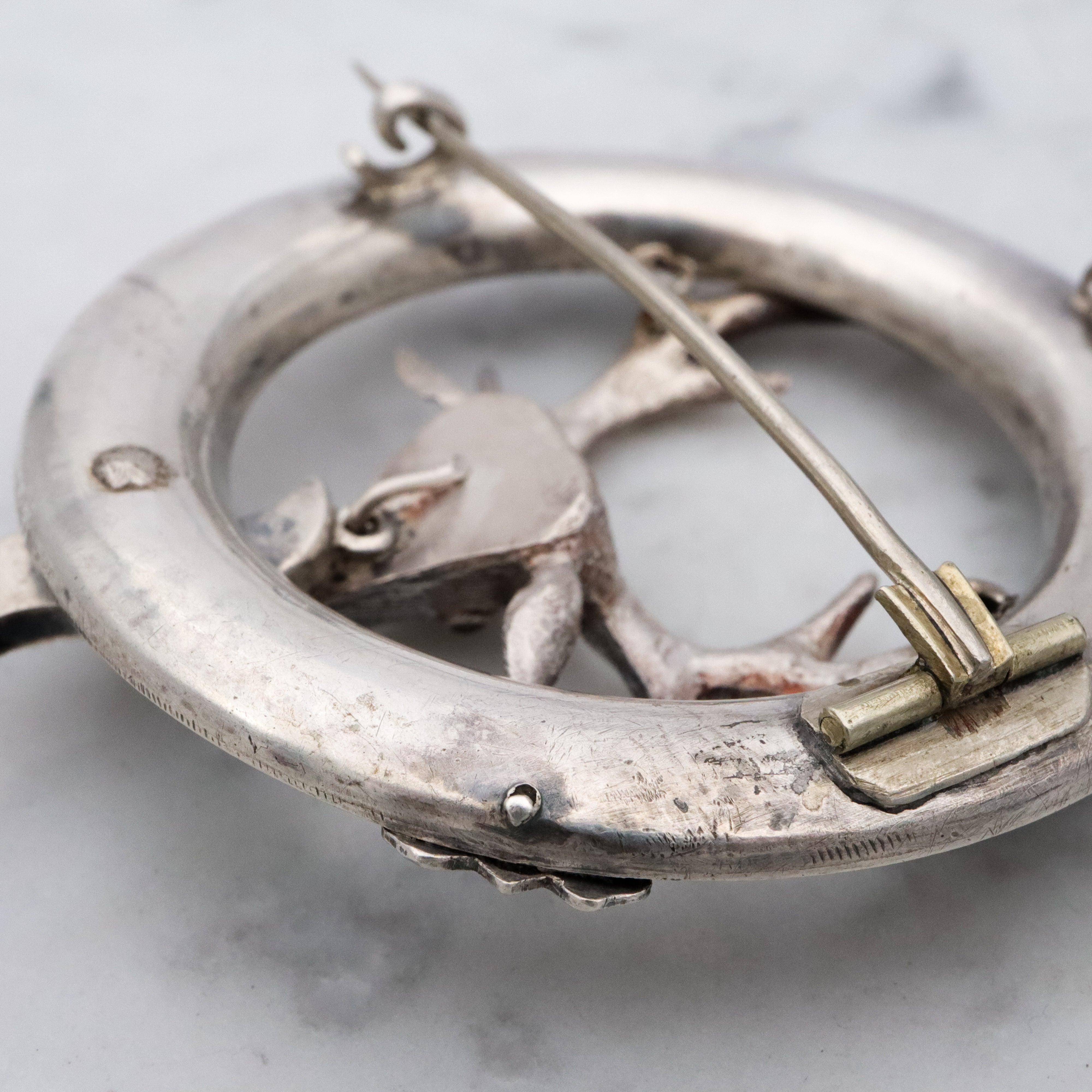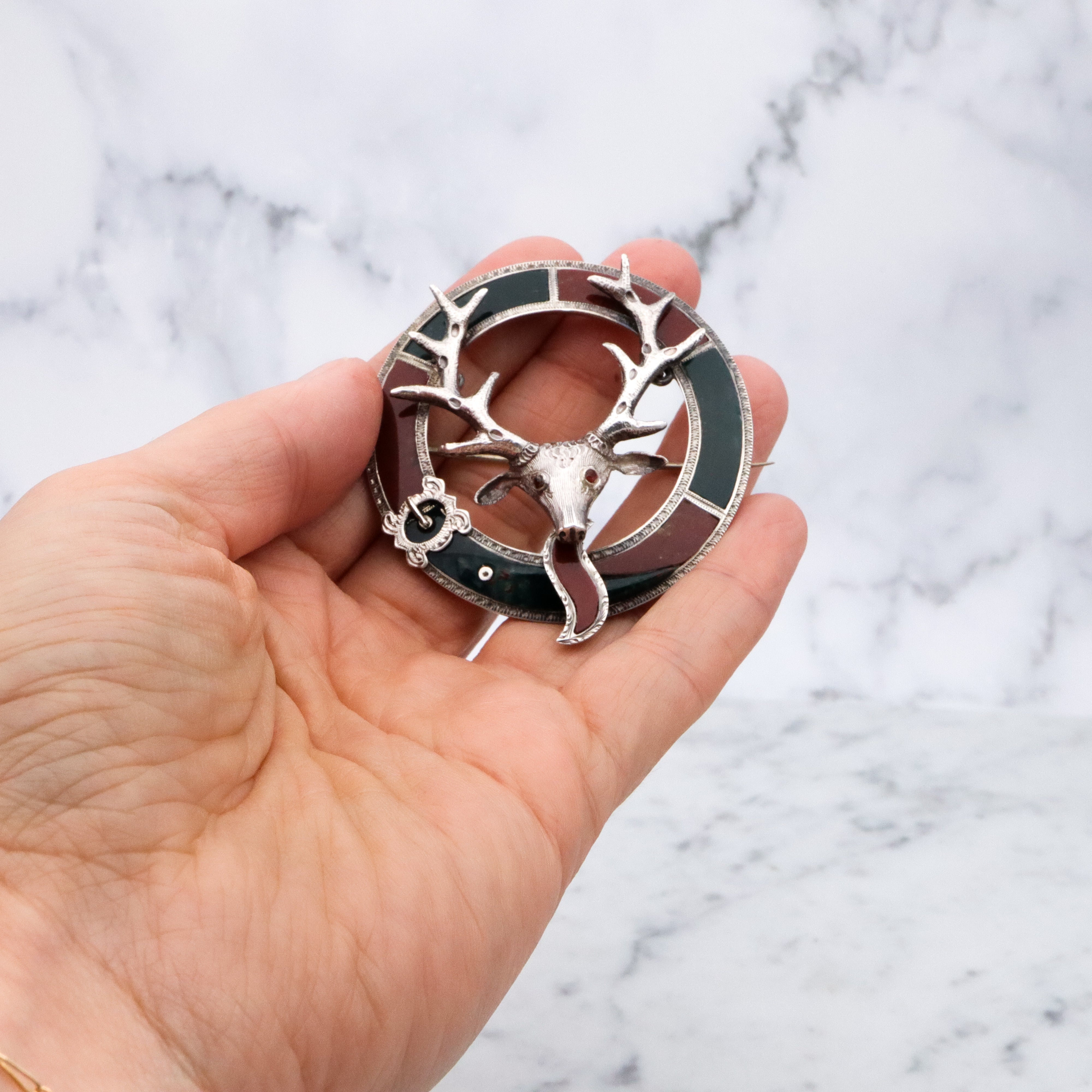 This Victorian era substantial circle brooch comes from the Scottish Highlands and features an intricately engraved figural stag head with garnet eyes, set inside a round frame in the form of a belt and buckle, with inset bloodstone segments alternating green and red; there is a sash element that looks like the deer's tongue and a silver figural buckle. The pin also has a bale on the back so that it can be worn on a chain.