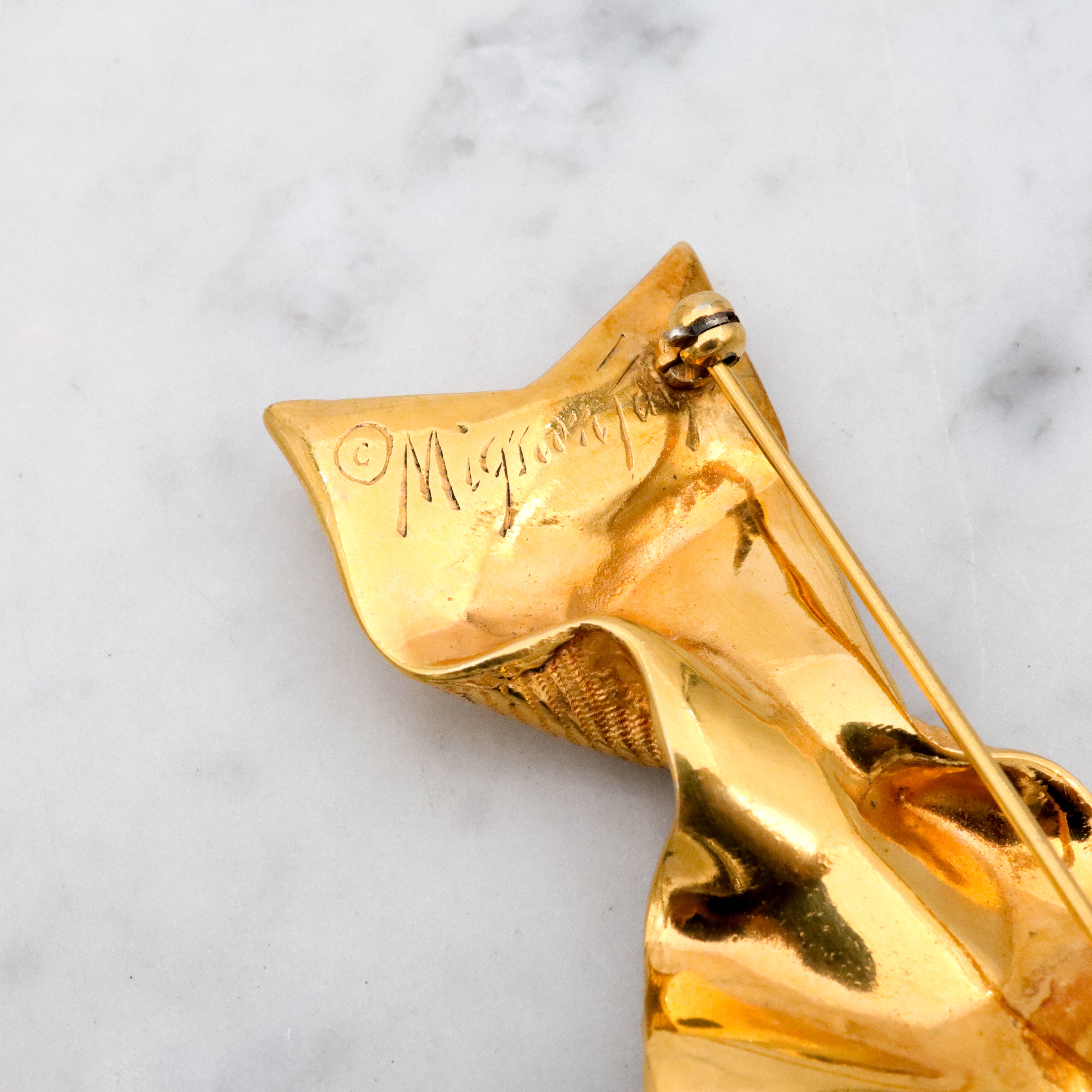 This fun vintage retro style brooch was made by New Orleans designer Mignon Faget and features a trompe l'oeil style gold plated grosgrain ribbon twisted into a bow shape.