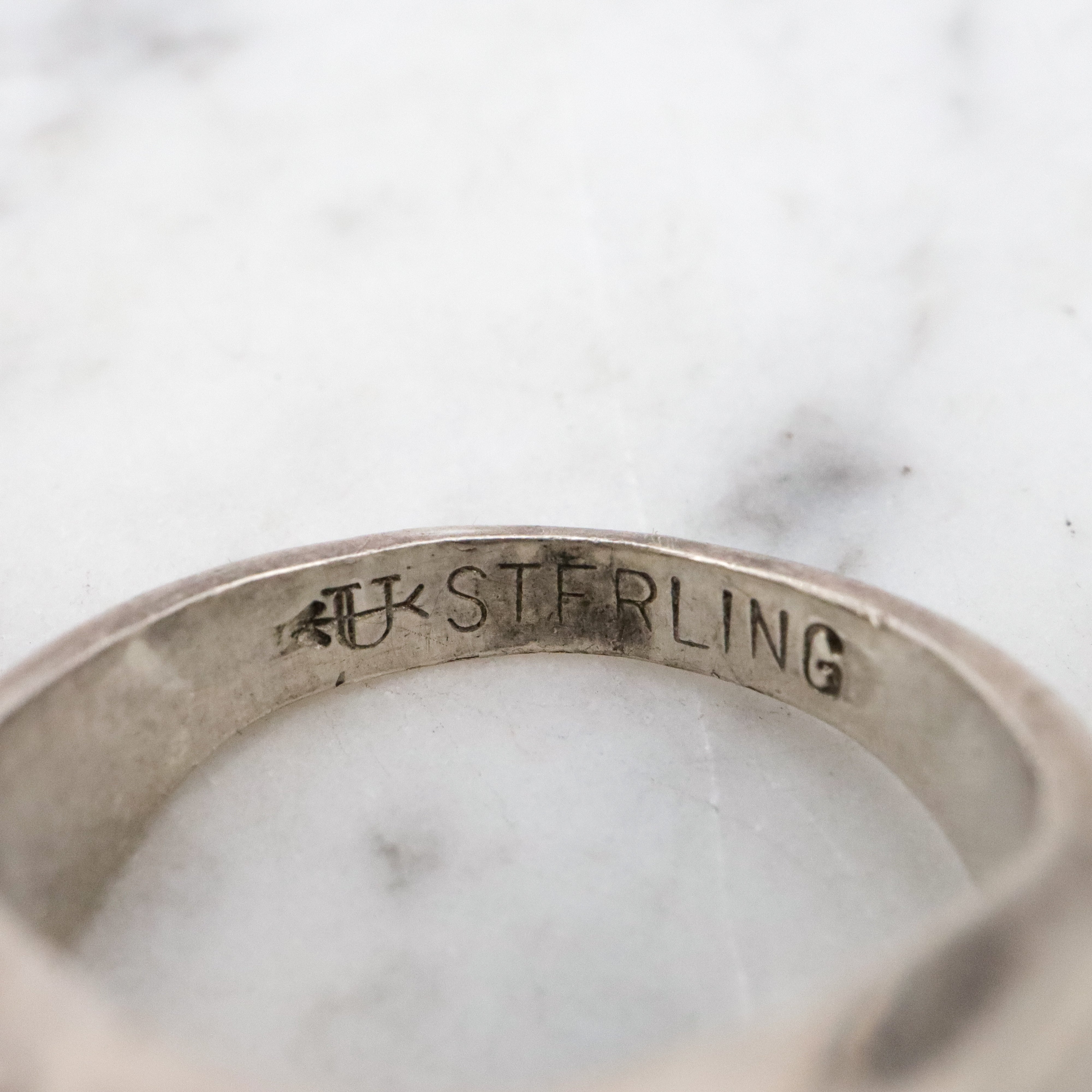 This chunky Art Deco era ring was made by Uncas and is made of sterling silver with a rhodium plating; it features a geometric asymmetrical design each shoulder having different engraved designs and a center faceted quartz crystal gem solitaire.