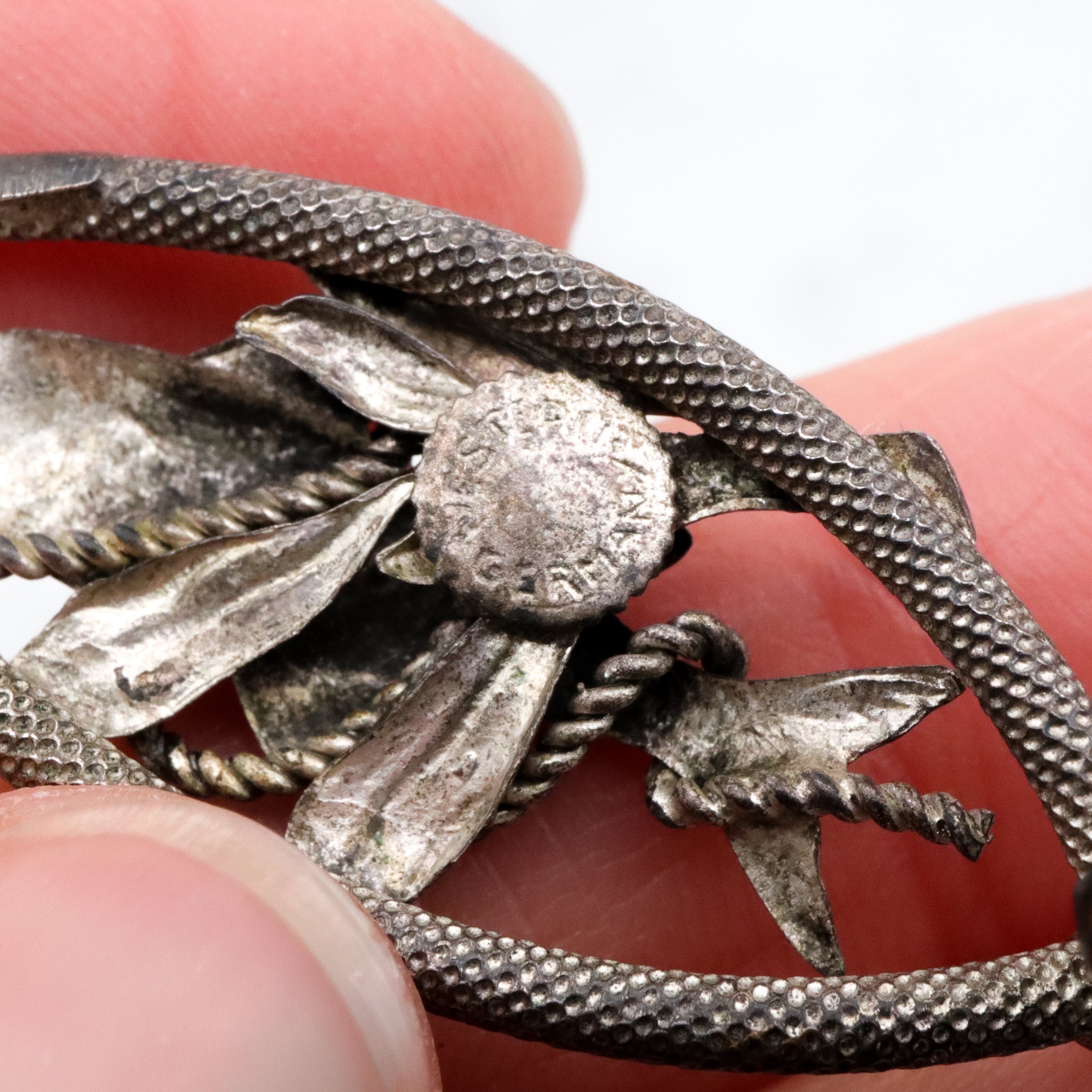 This highly detailed brooch was made in West Germany in the 1950s and features a fish with a rope wire wrapped around its body & attached to its mouth, set on top of an oval textured tube frame.