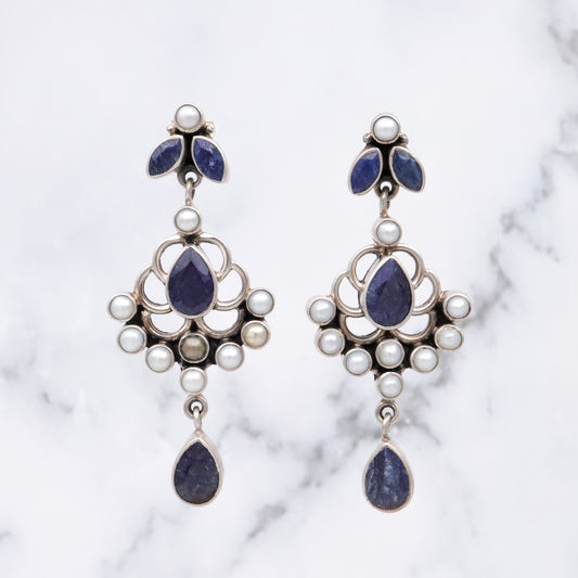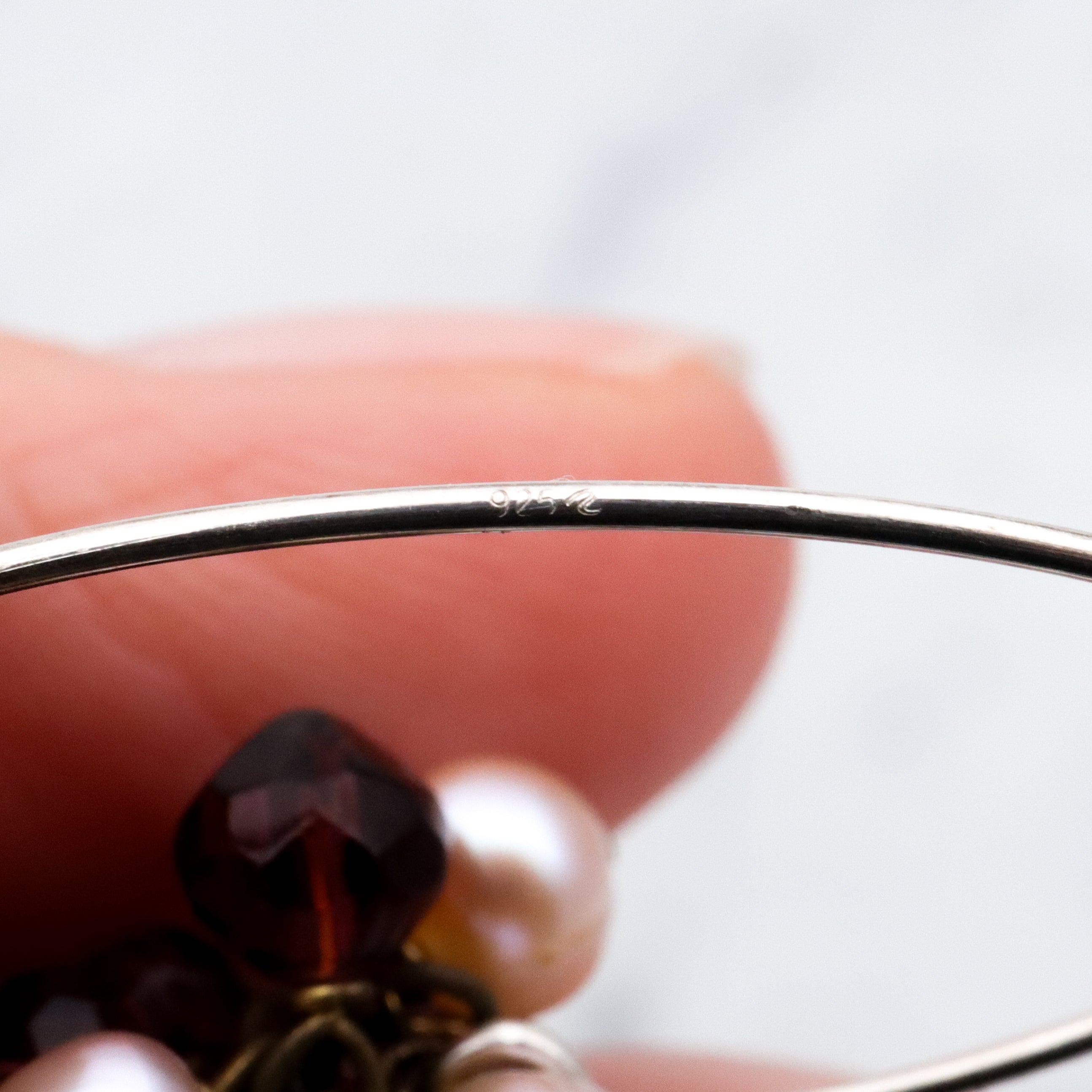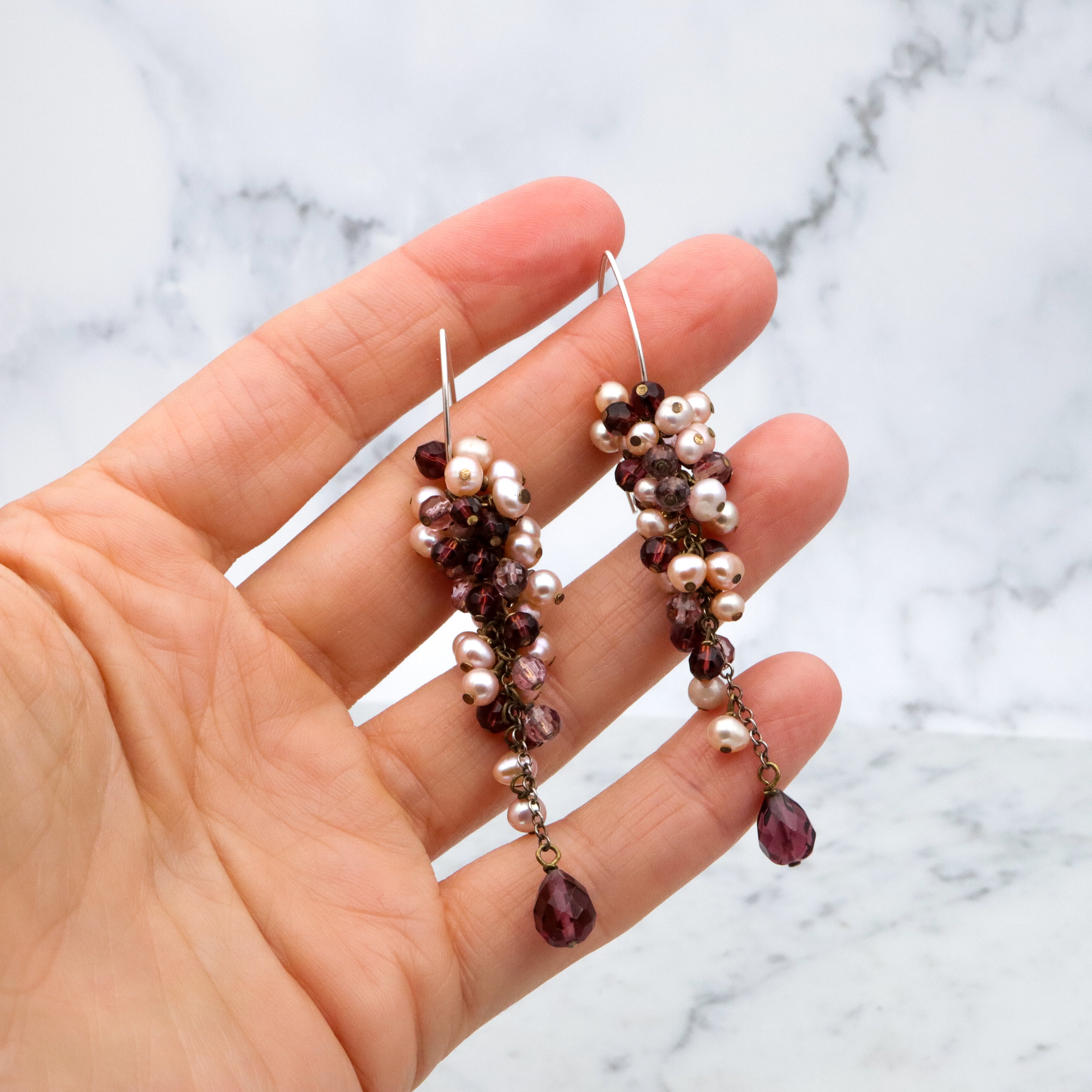 These fun vintage statement earrings feature a grape bunch design with many genuine champagne pearls clustered together with faceted amethyst glass beads, each with their own loop connector, tapering at the end and finished with a pear faceted amethyst glass drop.