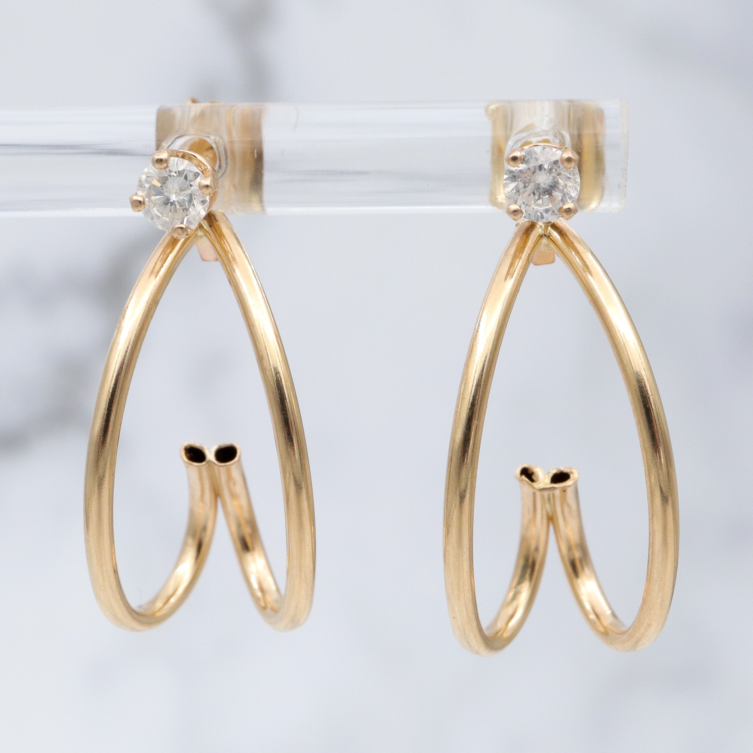 These Retro 14k gold earrings feature a day & night interchangeable jacket design. They can be worn as just 3mm diamond stud earrings or with the gold tube swirl jackets as shown in photos. These earrings weigh 1.5 grams and have a hang length of 23mm. They are in excellent vintage condition with light wear and are marked as shown.