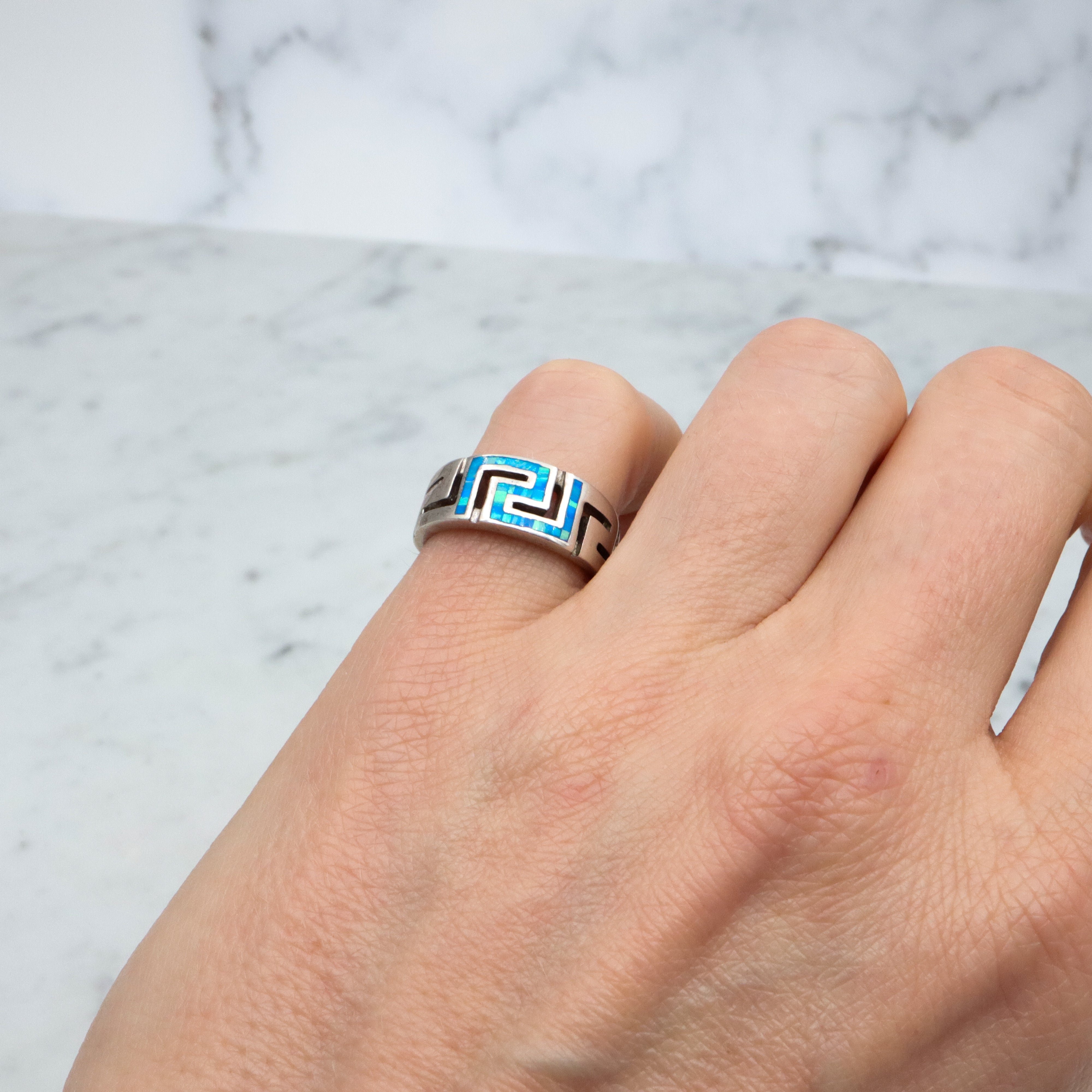 This striking vintage sterling silver ring features an open work Greek meander key design with a front of inlaid opal mosaic tiles.
